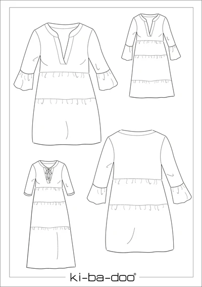 Nelina ist ein luftiges Kleid im Boho-Stil. Es ist weit schwingend im Rockbereich und locker sitzend im oberen Blusenbereich. Das Kleid verfügt über verschiedene Rocklängen und Ärmellängen. Der Kragen hat zwei Varianten: Stehkragen oder Schluppe. Der ist Ausschnitt ist leicht V-förmig angelegt.