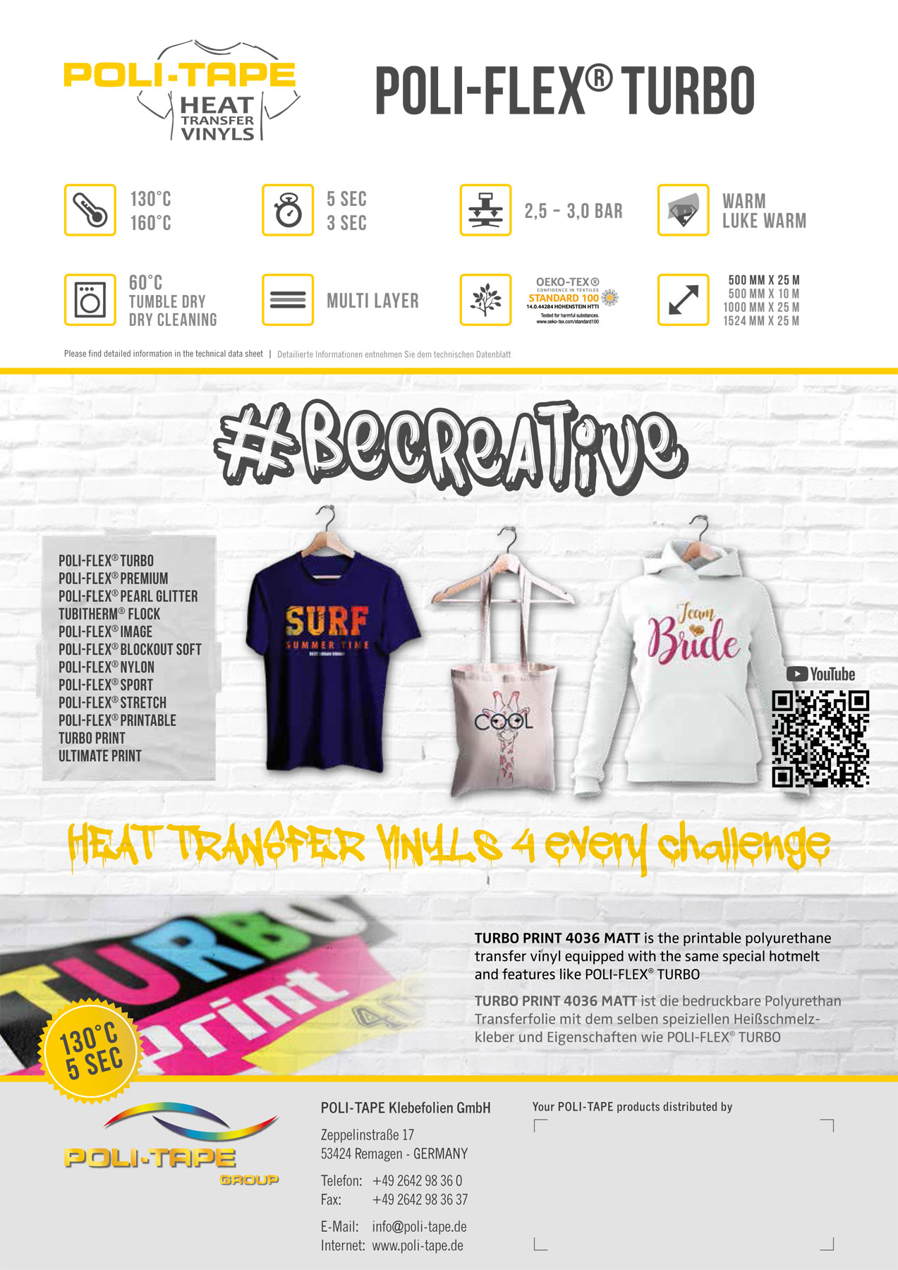 Mit der POLI-FLEX® TURBO Flexfolie veredeln Sie Ihre Textilien in Rekordzeit! Dank der innovativen Technologie genügt bereits eine Presszeit von nur 3–5 Sekunden bei materialschonenden 130–160°C. Das spart nicht nur Zeit, sondern schont auch empfindliche Stoffe – ohne Abstriche bei Qualität oder Haltbarkeit.